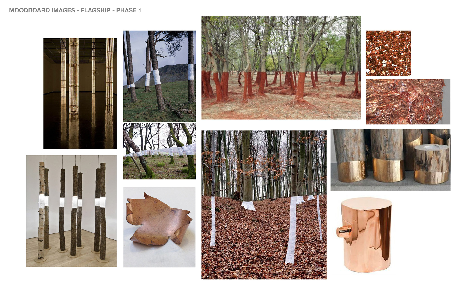 This flagship display was designed to transition from an autumnal wood scene to a Christmas winter forest. Autumn was created by filling the full height windows with real silver birch trees, each wrapped with a strip of glitter encrusted fabric. Real wood plinths were sprayed copper to give varying height to the mannequins.