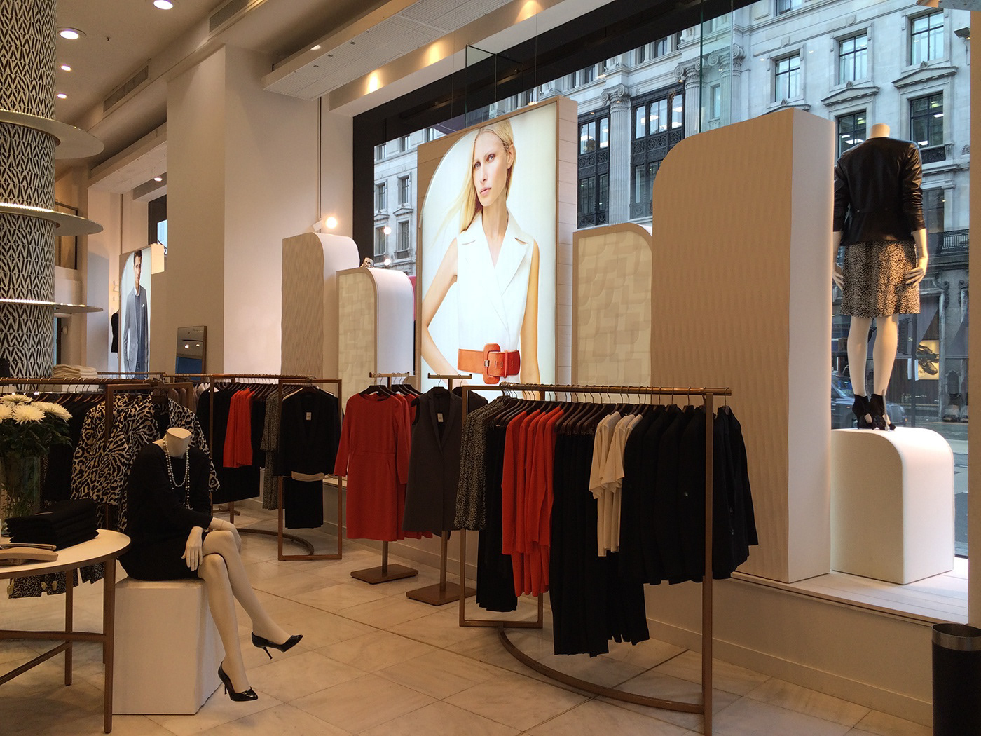 This late spring update required a backdrop to compliment the pastel, camel and muted tones in the collection. Blossoming floral graphics was created at varying scale and opacity on suspended stretched fabrics to create a layered screen effect, creating a pleasing effect both from outside and inside the store.