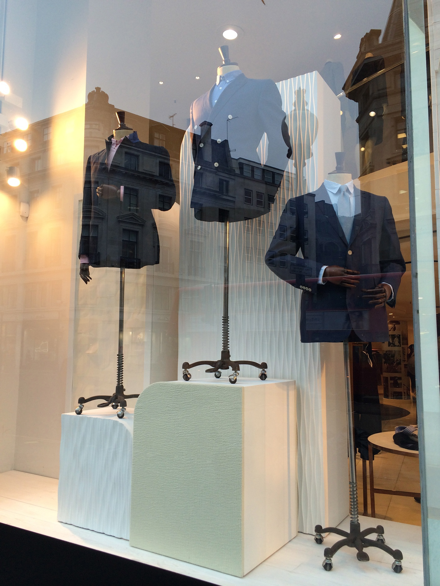 A display scheme designed to launch the Spring/Summer 15 season. Inspired by the press day backdrops - a variety of textured white props were designed for the new collection to stand out against.