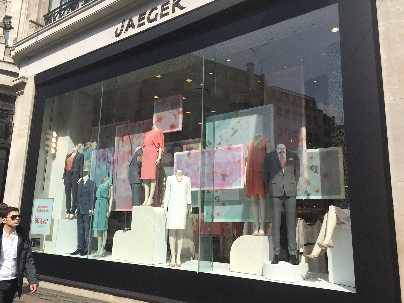 Jaeger collaborated with David Bailey to shoot the AW15 collection - this window scheme was designed to interact with the mannequins playfully with suspended polaroid style frames and plinths in the same form. Lighting props and trussing elements of a photo shoot were bought into the windows and in store displays. The polaroid frames were produced as a rollout scheme for all 30 Jaeger stores.